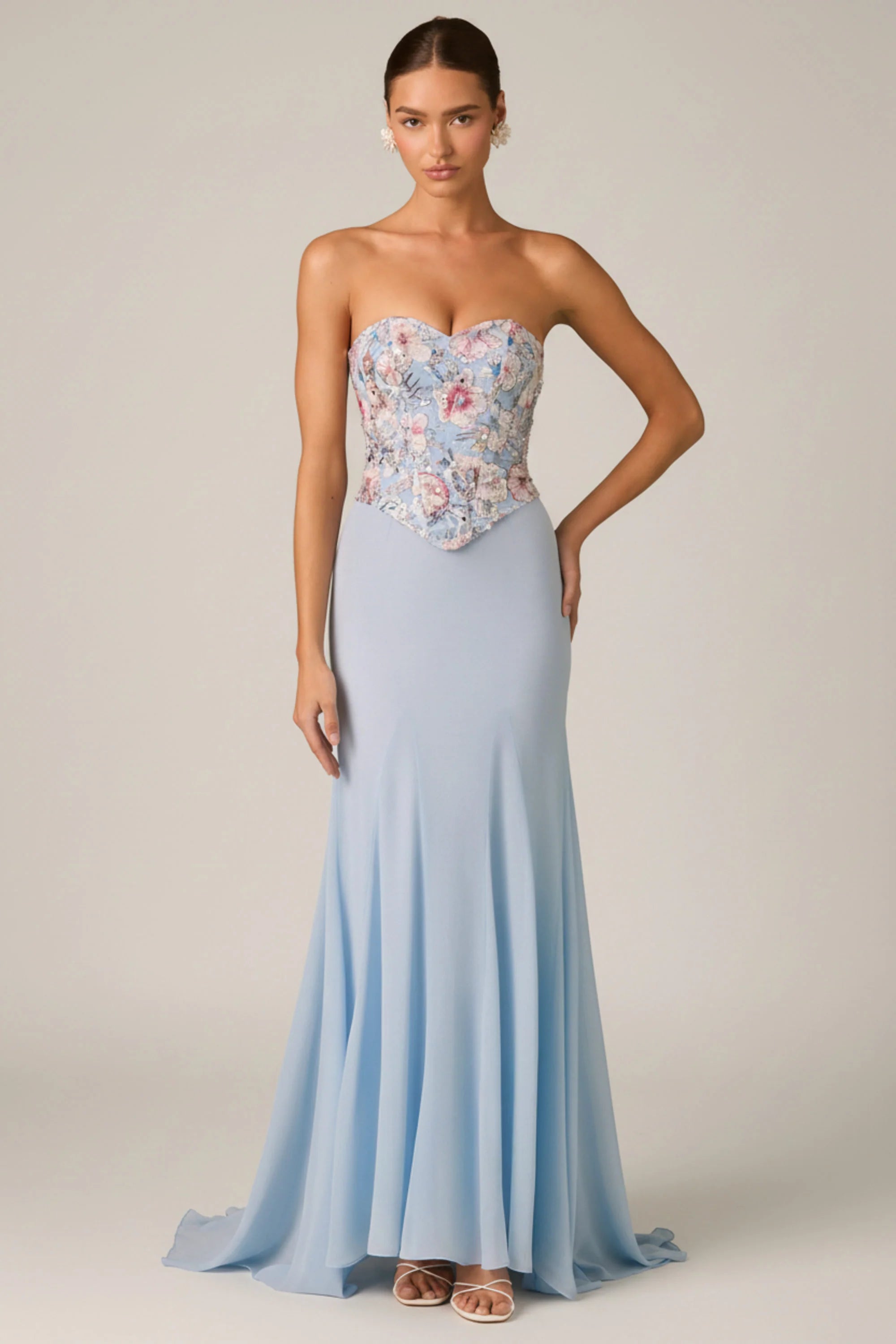 Divinely crafted. Spotted on the runway first, the Lysana gown is designed for extra-special occasions and features a fully embellished corset bodice overlaid with watercolour-inspired custom floral appliqués brought to life with sparkling sequin embellishments. It features a floor-skimming chiffon skirt with godet pleats for dynamic movement and is complete with signature lace-up detailing at the back that can be adjusted for your perfect fit.