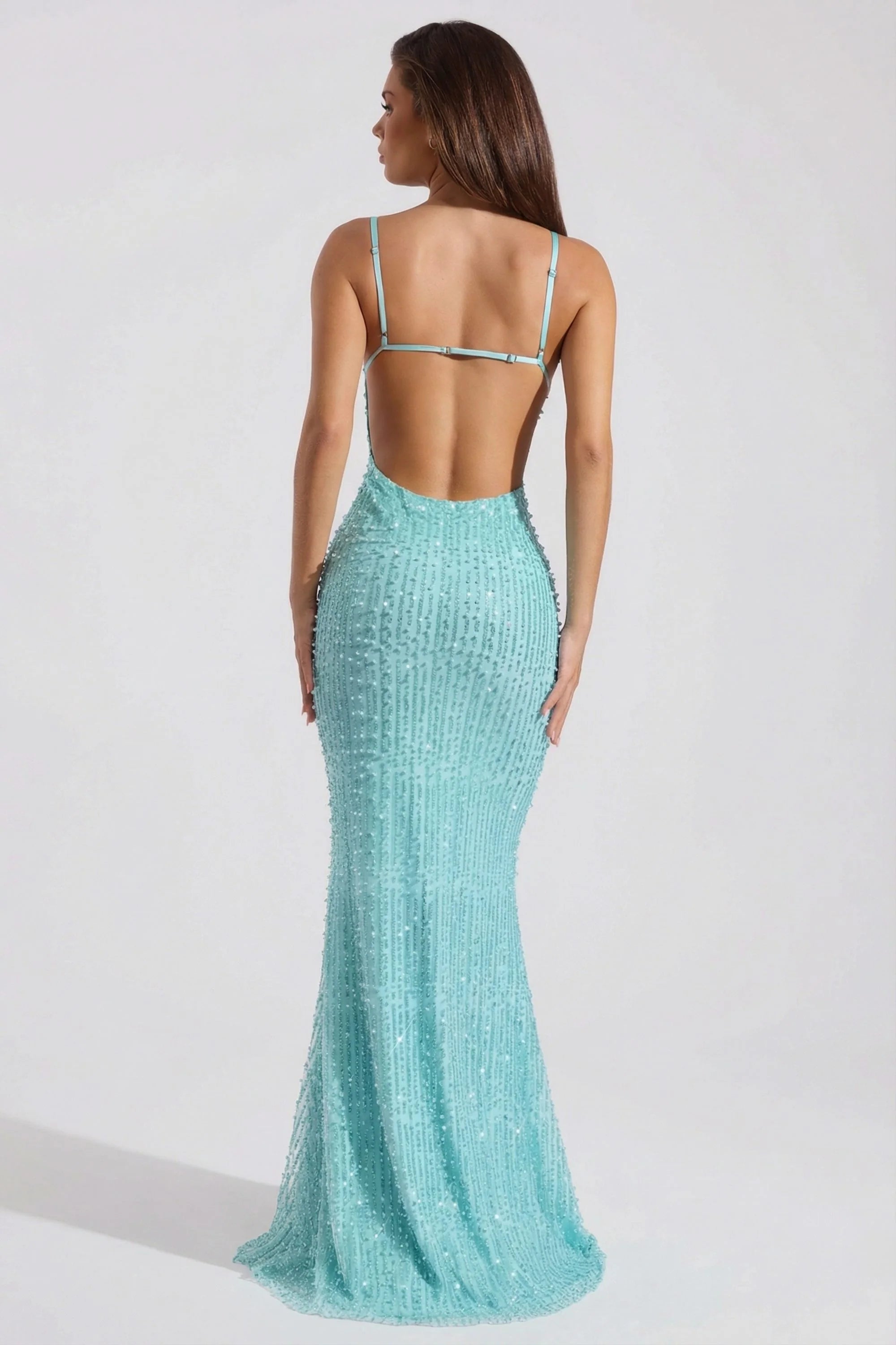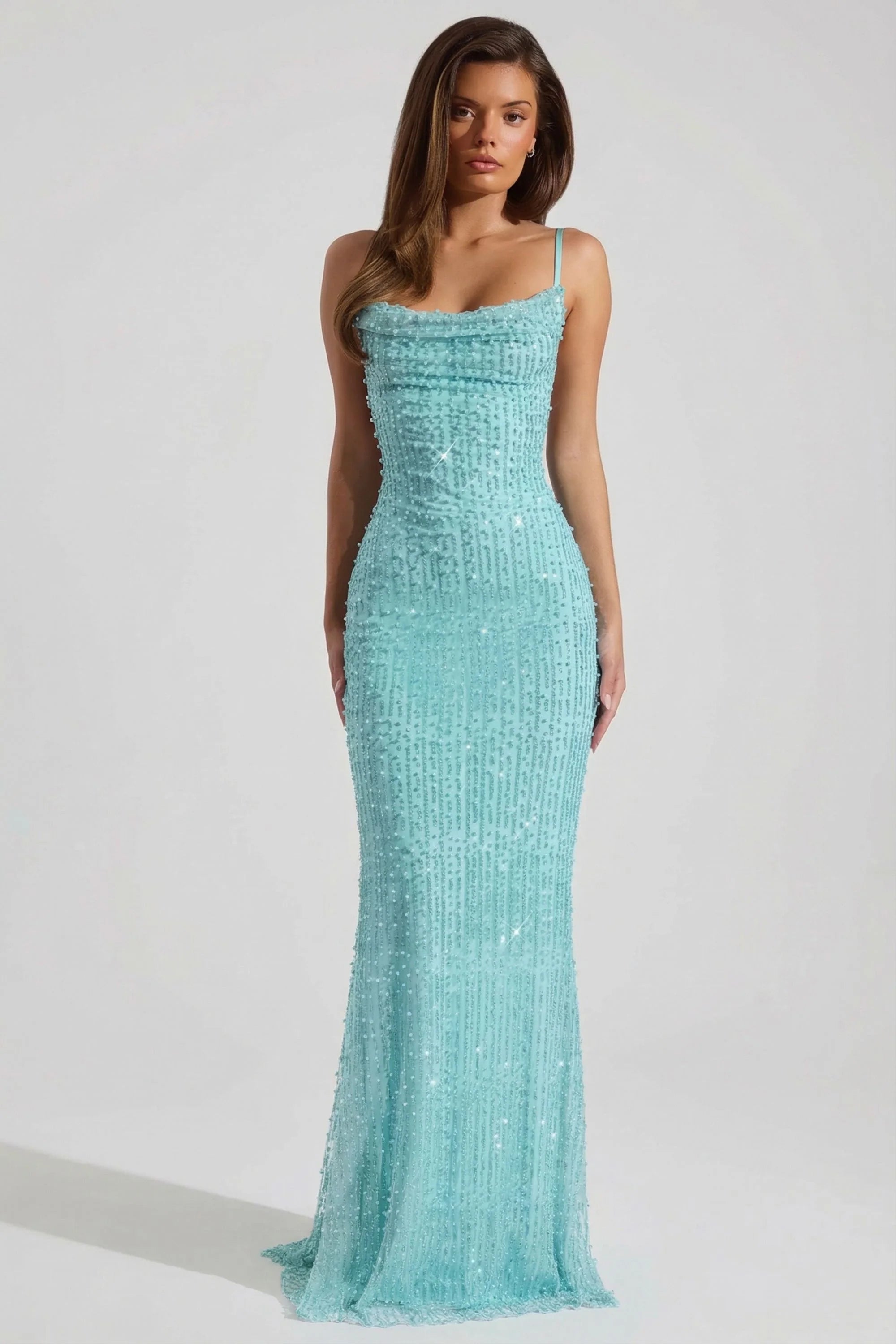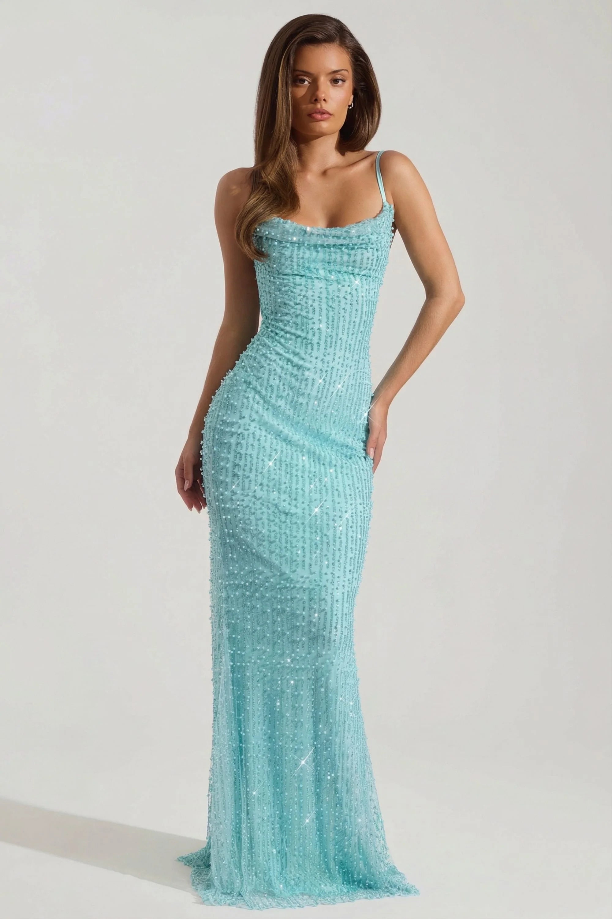 Iconic sparkle. Capturing attention from every angle, the Nivalis maxi dress is crafted from our premium, lightweight glittered mesh fabric overlaid with faceted three-dimensional beads and fully lined for the perfect amount of coverage. It’s framed with a cowl neckline and statement open back with adjustable straps for the perfect fit.