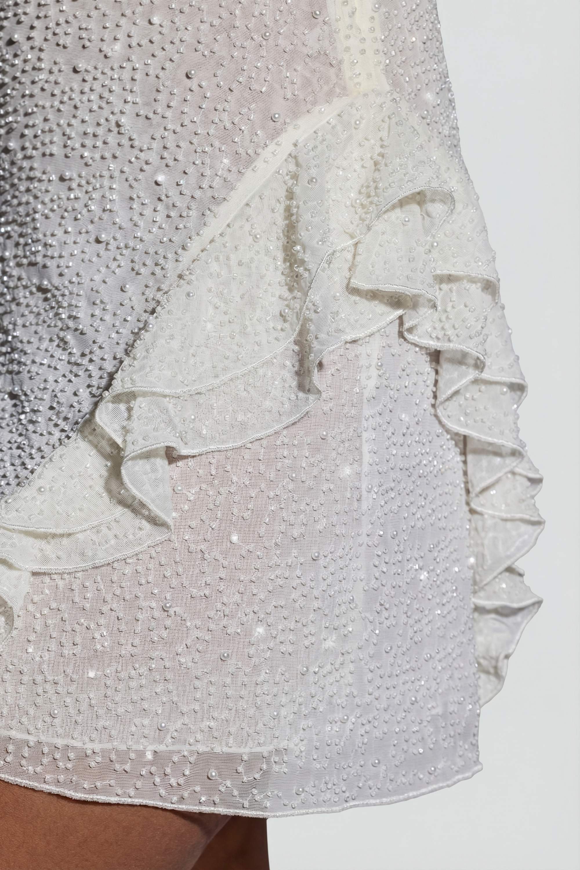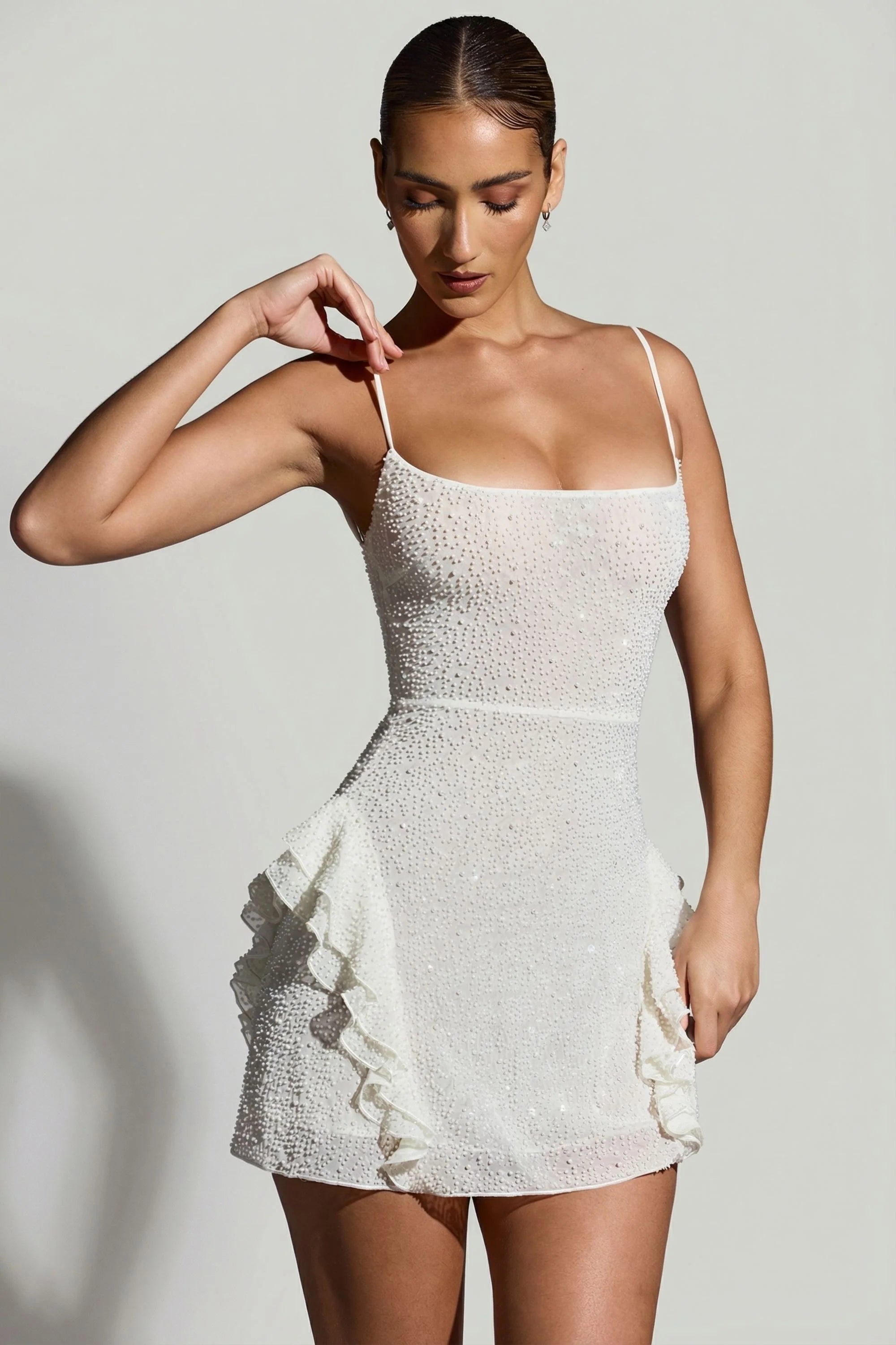 Feminine and flirtatious, the Domblans mini dress is cut from our premium dual-layered mesh fabric and features all-over embellishment. Perfect for sparkling under dance floor spotlights, Domblans showcases bead and crystal adornments, a flattering curved neckline, and ruffle detailing at the hips.