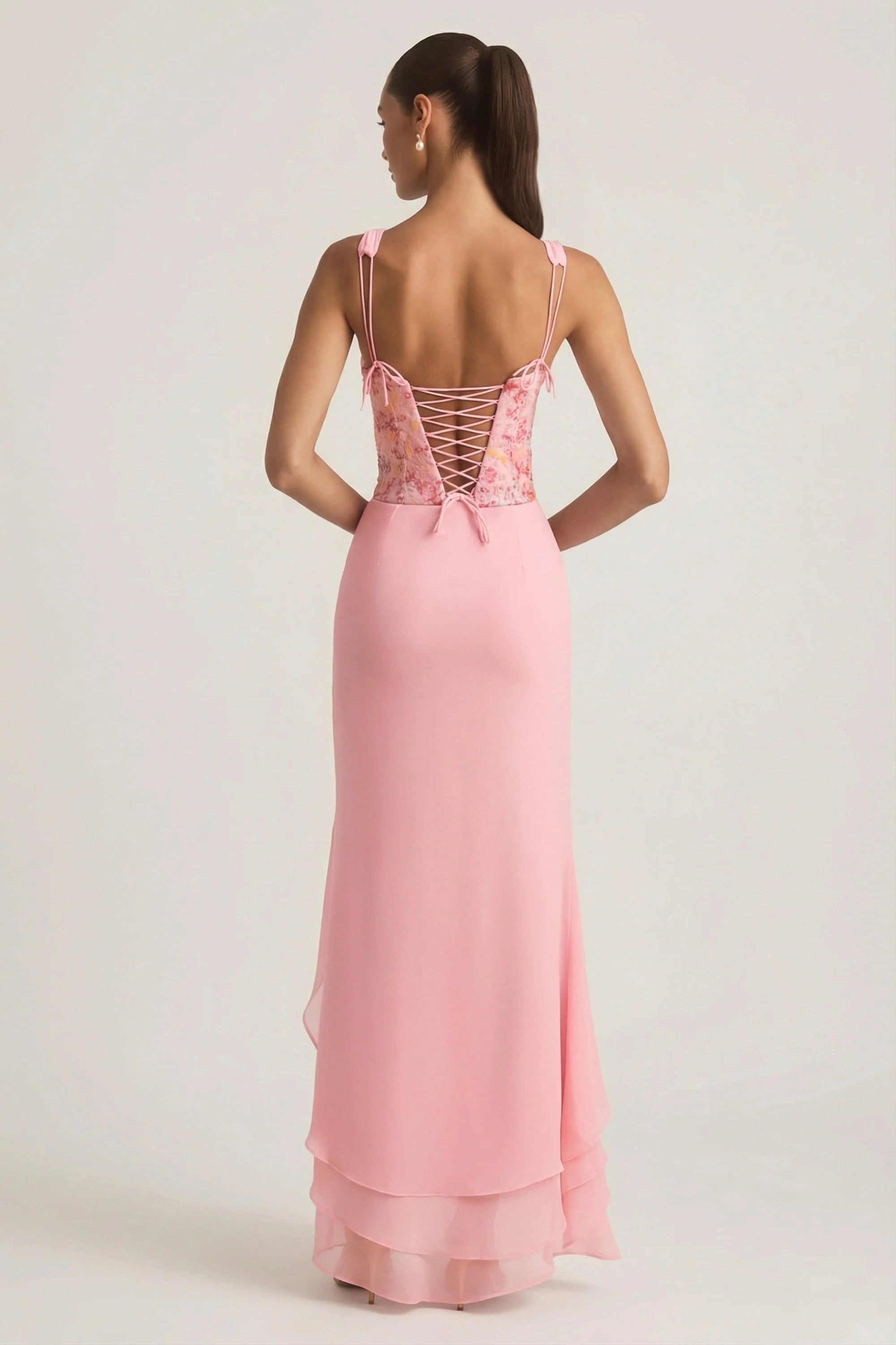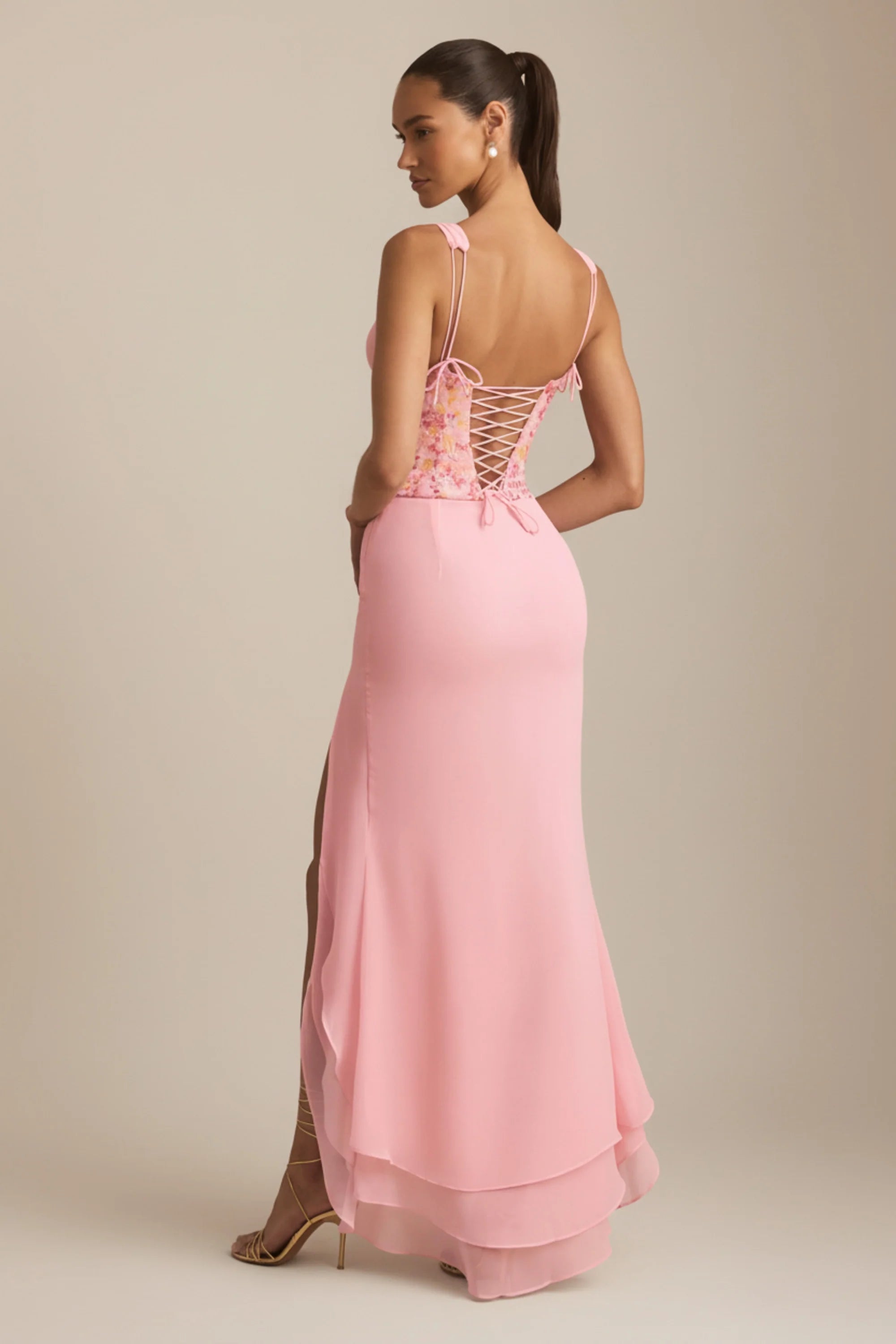 Worth making plans for, the Nathalia maxi dress is cut from lightweight chiffon with a plunging V-neckline, waterfall split hem and statement lace-up back. It’s overlaid with a waist-cinching corset decorated with coral-inspired embellishments that sparkle under spotlights. The rouleau straps are fully adjustable for your perfect fit.