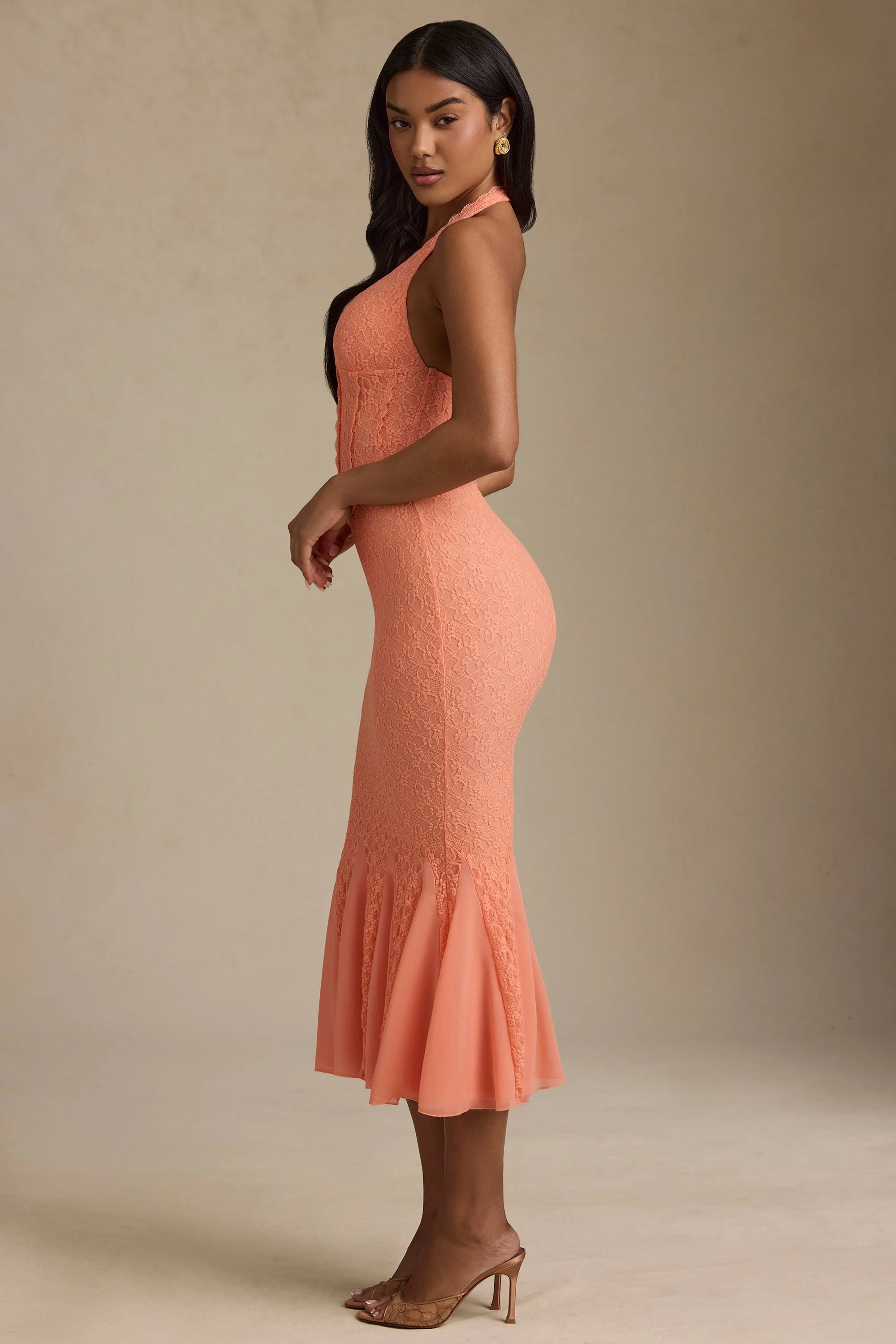 Step into spring styling with the Olena midaxi dress. Designed to hug every curve to perfection, it’s crafted from premium stretch lace, lined with soft, sheer jersey and cut to a fishtail silhouette with a corset-inspired bodice elevated with delicate scalloped trims. It’s framed with a plunging halter neckline traced with pretty scalloped trims and features a godet-pleated hem for dynamic movement.