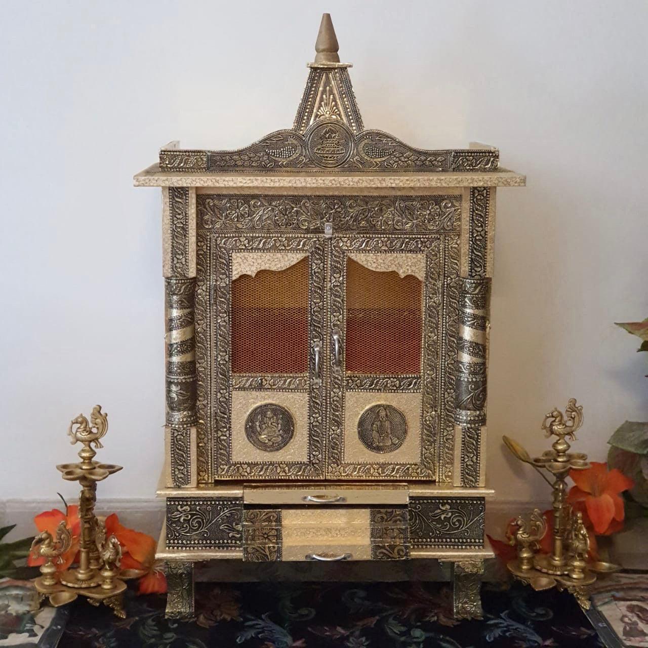 The beautiful handmade wooden temple features four legs that let it sit perfectly on any flat surface. The wooden temple or mandir is quite handy and portable.