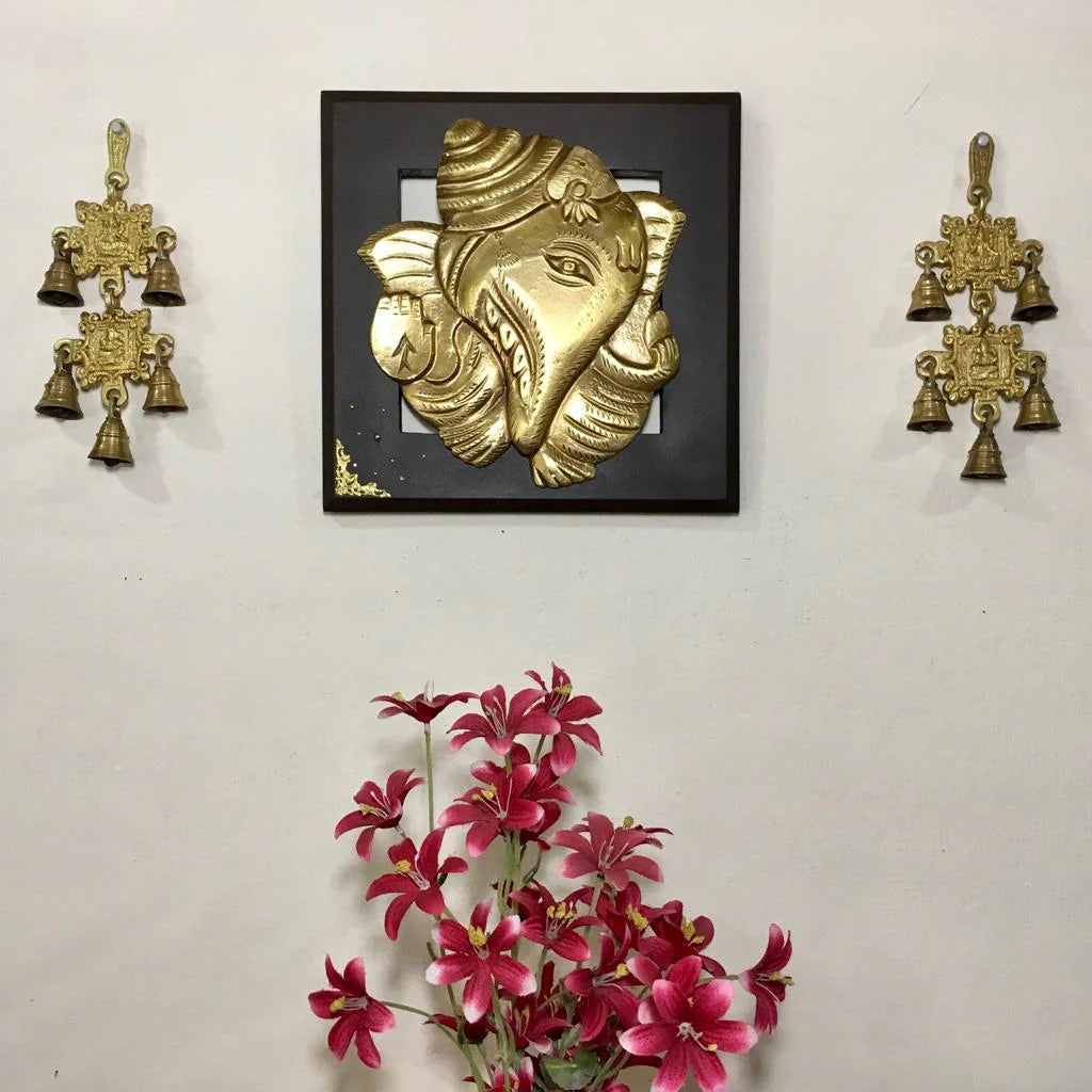 Exquisitely crafted Brass plated wooden Ganpati motif with a black wooden border with Brass Laxmi Ganesha Bell.