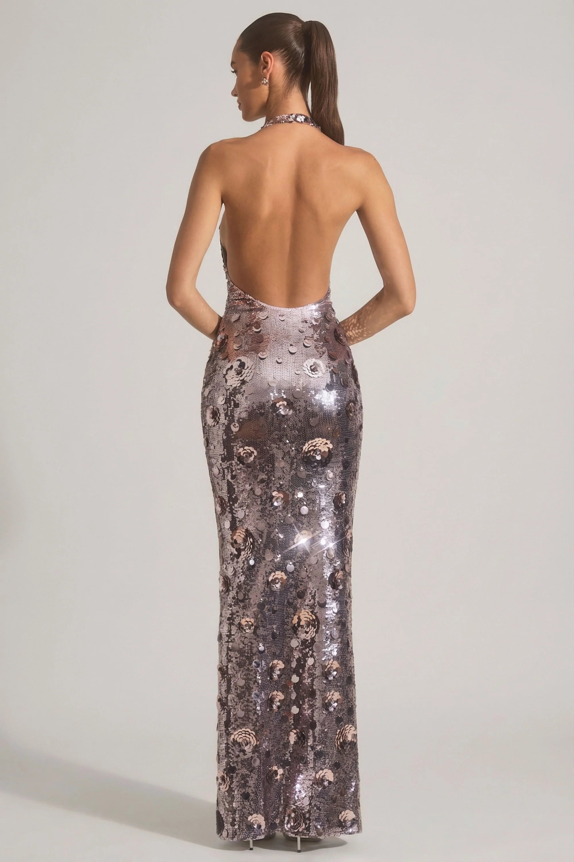 High-octane glamour. The Nolira maxi dress is crafted from our premium stretch mesh fabric overlaid with scores of tactile sequins and three-dimensional flowers. Cut to a halterneck silhouette with a plunging neckline, the sultry low back cements the statement look.