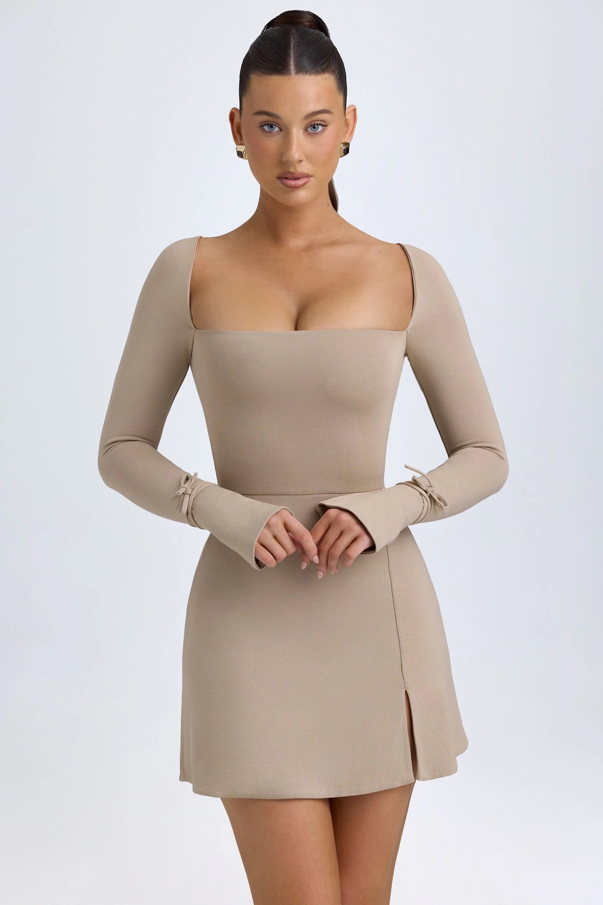 Sculpting and seductive, the Baize mini dress is perfect for creating an enviable silhouette. Cut from our premium modal fabric in two new season shades, the Baize mini features a bust flattering straight neckline with angled shoulders to further enhance your assets. Long flare sleeves are accentuated with self tie fastenings whilst the mini skirt features a seductive split on the left side. Understated and ultra flattering, Baize is a must have to bring the heat to cooler evenings.